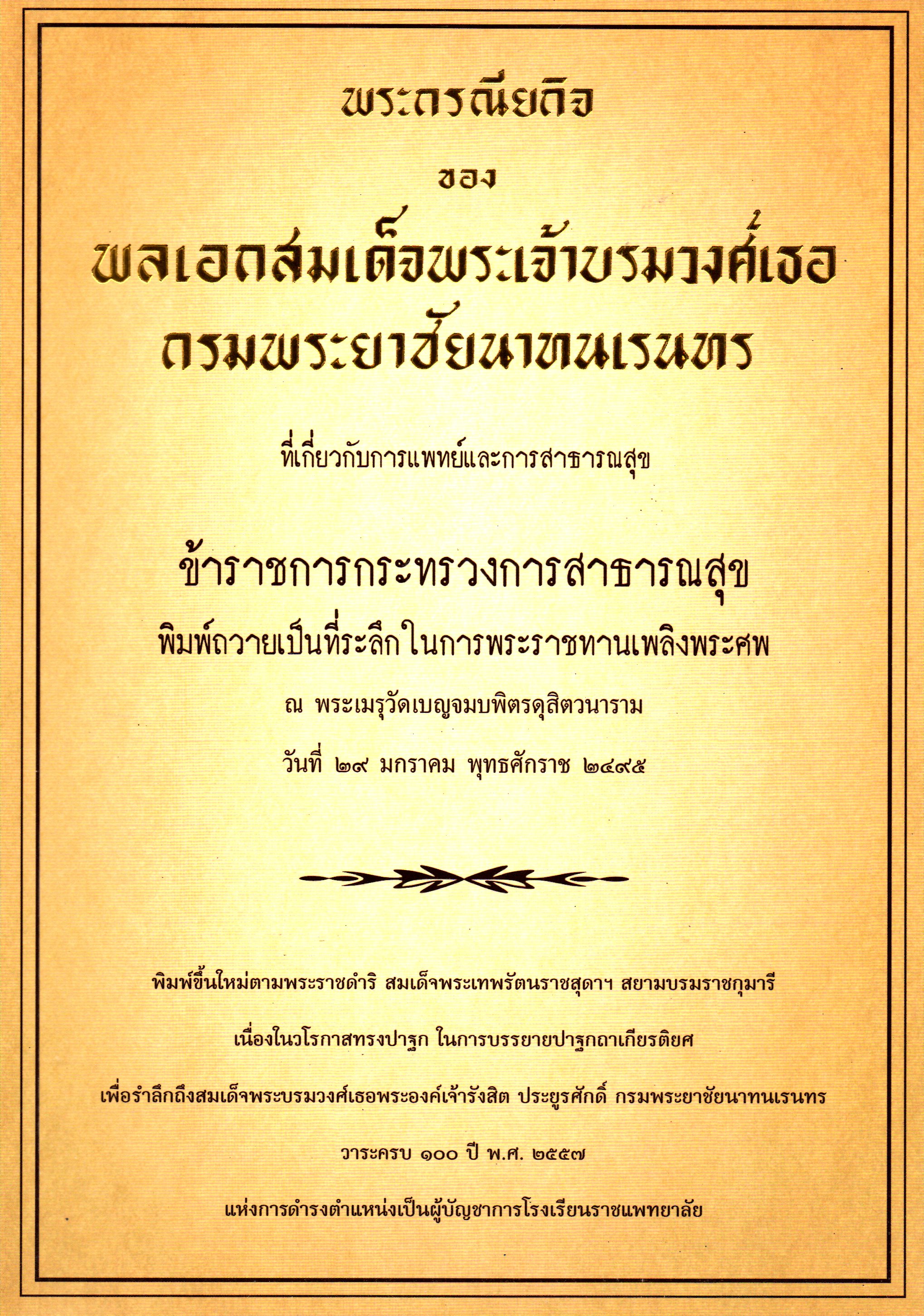 พิมพ์ขั้นใหม่ตามพระราชดำริ สมเด็จพระเทพรัตนราชสุดาฯ สยามบรมราชกุมารี เนื่องในวโรอาสทรงปาฐก ในการบรรยายปาฐกถาเกียรติยศเพื่อรำลึกถึงสมเด็จพระบรมวงศ์เธอพระองค์เจ้ารังสิต ประยูรศักดิ์ กรมพระยาชัยนาทนเรนทร วาระครบ 100 ปี พ.ศ. 2557 แห่งการดำรงตำแหน่งเป็นผู้บัญชาการโรงเรียนราชแพทยาลัย |