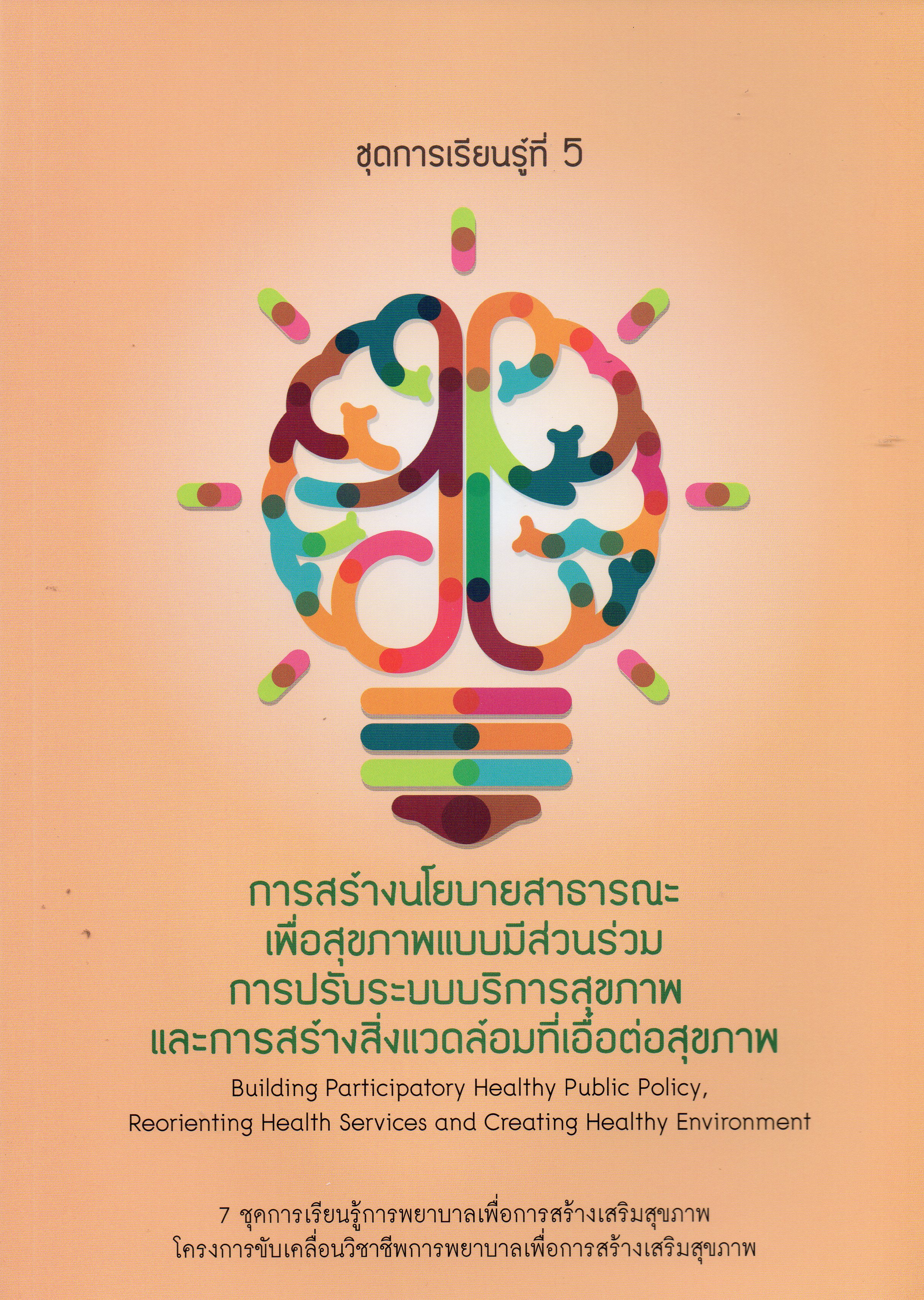 ชุดการเรียนรู้ที่ 5 การสร้างนโยบายสาธารณะเพื่อสุขภาพแบบมีส่วนร่วมการปรับระบบบริการสุขภาพและการสร้างสิ่งแวดล้อมที่เอื้อต่อสุขภาพ: Building participatory healthy public policy, Reorienting health services and creating healthy environment / บรรณาธิการ ศิริพร ขัมภลิขิต และวงจันทร์ เพชรพิเชฐเชียร