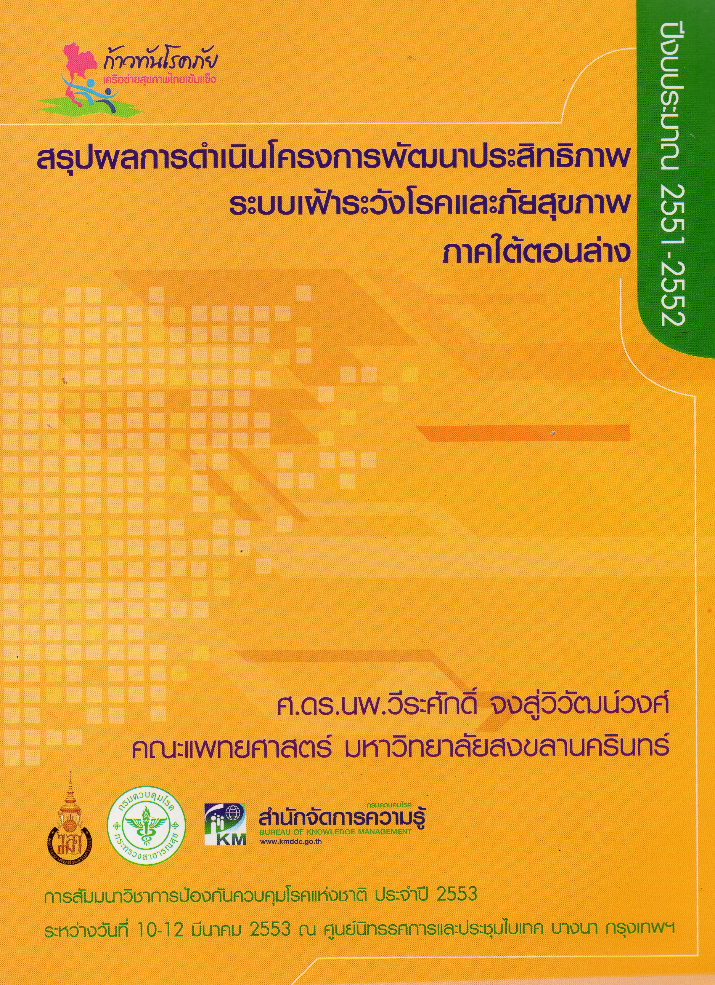 สรุปผลการดำเนินโครงการพัฒนาประสิทธิภาพระบบเฝ้าระวังโรคและภัยสุขภาพภาคใต้ตอนล่าง ปีงบประมาณ 2551-2552 : การสัมมนาวิชาการป้องกันควบคุมโรคแห่งชาติ ประจำปี 2553 ระหว่างวันที่ 10-12 มีนาคม 2553 ณ ศูนย์นิทรรศการและประชุมไบเทค บางนา กรุงเทพฯ / วีระศักดิ์ จงสู่วิวัฒน์วงศ์ |