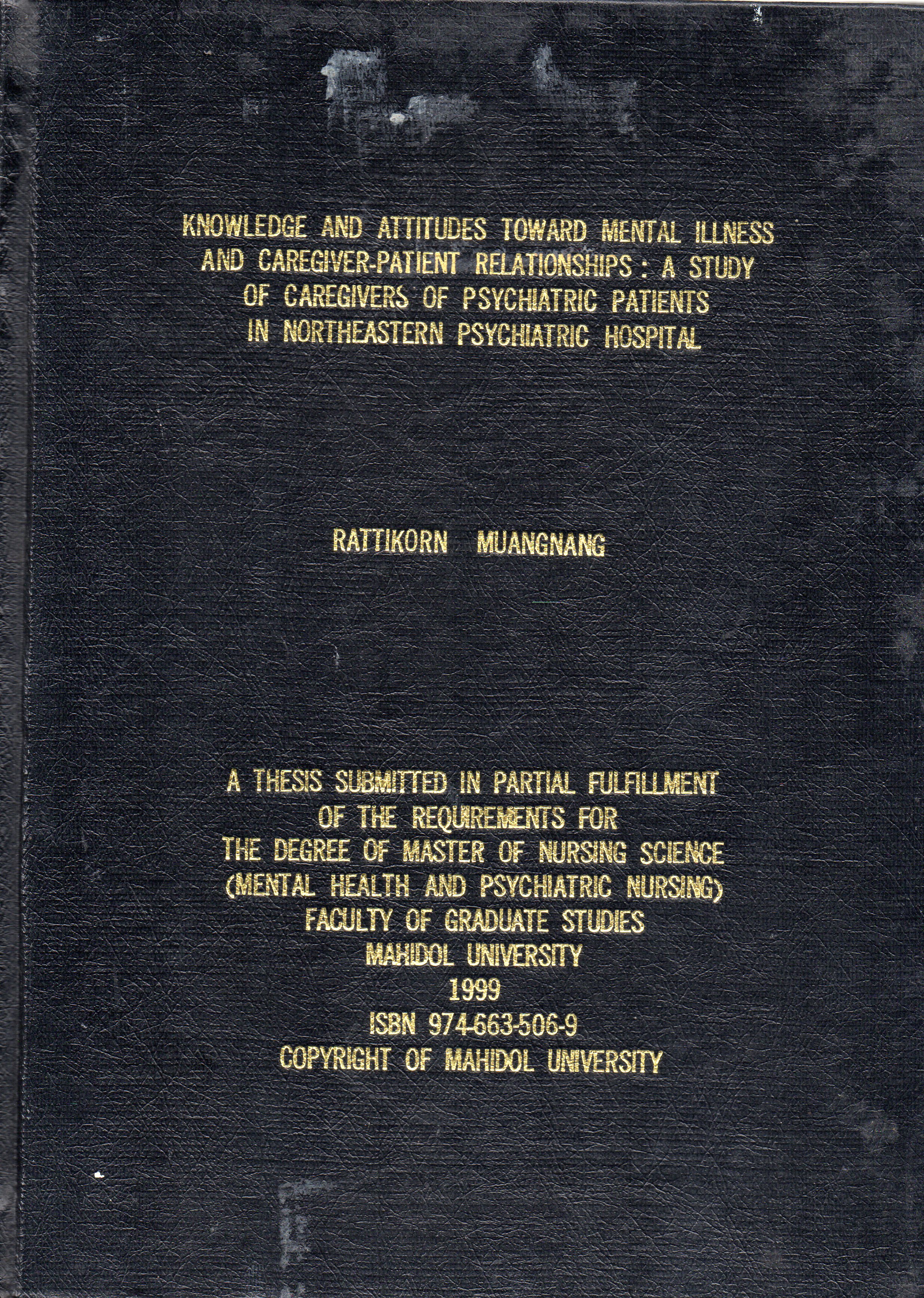 Knowledge and Attitudes toward mental illness and Caregiver Relationships : A Study of Caregivers of Psychiatric patients in Northeastern Psychiatric hospital/ Rattikorn Muangnang